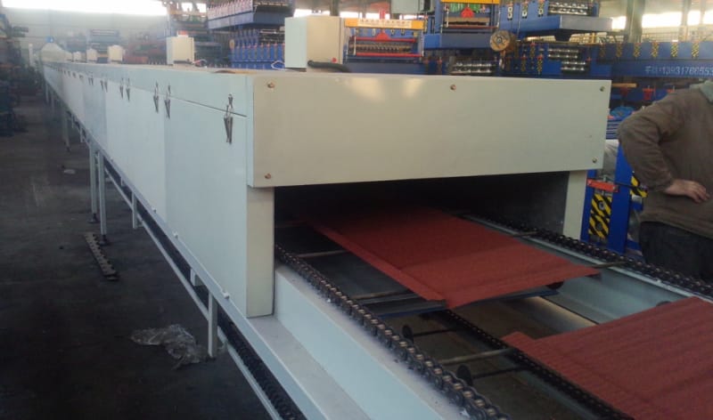 彩石瓦設備是以氣、電、機械為一體的,集噴膠、布沙、烘干等功能為一體的全自動生產線。